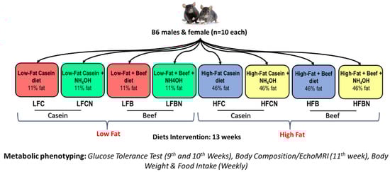 Animal study and diets: Male and female virgin C57BL/6J mice, aged 4–5 weeks old, were purchased from Jackson Laboratory (Bar Harbor, ME, USA). After one-week acclimatization, male and female B6 mice were randomized into 8 customized diets (10 mice per each group: total 160 mice) based on the protein source (either beef protein: B or casein: C), pH enhancement (through beef or casein treatment with ammonia, prior to incorporation of these protein sources into mouse diets) and dietary fat content (low fat:11% fat kcals %, or high fat: 46% fat kcals %): (i) low fat (11% fat kcals %) casein (LFC), (ii) LF diet with pH-enhanced casein (ammonia treated: N) (LFCN), (iii) low fat lean beef (LFB), (iv) LF diet with pH-enhanced beef (ammonia treated) (LFBN), (v) high fat (46% fat kcals %) casein (HFC), (vi) HF diet with pH-enhanced casein (HFCN), (vii) HF with beef (HFB), and (viii) HF diet with pH-enhanced beef (HFBN). Mice were maintained on these diets (in the pellet form) throughout the study. Cooked ground beef was kindly provided to us by Empirical Foods, Inc (North Sioux City, SD, USA). Nutritional analyses of the beef products were conducted by an independent laboratory (Eurofins Scientific Inc. Des Moines, IA, USA), and diets were prepared based on these analyses, by Research Diets Inc (New Brunswick, NJ, USA). Detailed diet composition is provided in Supplemental Table S1 and the overall study design in Figure 1.