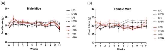 Weekly food consumption in (A) male and (B) female mice throughout the dietary intervention. LFC, low fat casein; LFCN, low fat casein pH enhanced; LFB, low fat beef; LFBN, low fat beef pH enhanced; HFC, high fat casein; HFCN, high fat casein pH enhanced; HFB, high fat beef; HFBN, high fat beef pH enhanced. p < 0.05; n = 8–10.