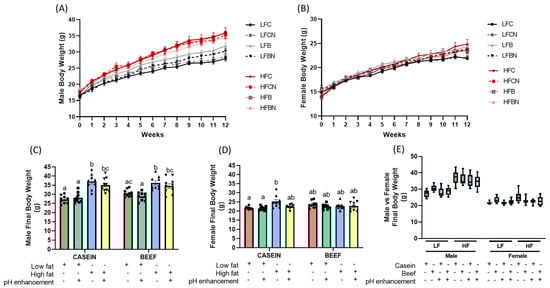 Sex-dependent effects of diet, protein source and pH enhancement on weight gain, and final body weight in diet induced obese male and female mice. Growth curves during the dietary interventions (A) male, (B) female mice, and the final body weight (C) male and (D) female mice. (E) Final body weight male vs. female mice. Data is presented as mean ± SEM. LFC, low fat casein; LFCN, low fat casein pH enhanced; LFB, low fat beef; LFBN, low fat beef pH enhanced; HFC, high fat casein; HFCN, high fat casein pH enhanced; HFB, high fat beef; HFBN, high fat beef pH enhanced. Common letters on the error bars indicate no significance (e.g., “a” is significantly different from “b” while “ab” indicates no significance compared to “a” and “b”). p < 0.05; n = 8–10.