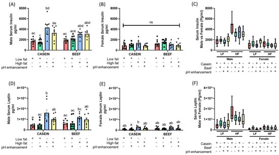 Effects of diet, protein source, pH enhancement and sex on serum metabolic markers in male and female mice. (A) Serum insulin levels in male mice. (B) Serum insulin levels in female mice. (C) Serum insulin levels in male vs. female mice. (D) Serum leptin in male mice. (E) Serum leptin in female mice. (F) Serum leptin levels in male vs. female mice. Data is presented as mean ± SEM. LFC, low fat casein; LFCN, low fat casein pH enhanced; LFB, low fat beef; LFBN, low fat beef pH enhanced; HFC, high fat casein; HFCN, high fat casein pH enhanced; HFB, high fat beef; HFBN, high fat beef pH enhanced. Common letters on the error bars indicate no significance (e.g., “a” is significantly different from “b”, and “ab” indicates no significance compared to “a” and “b”). p < 0.05; n = 8–10.