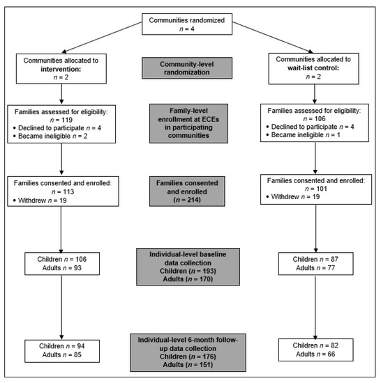 The six-month FRESH study employed a randomized wait-list controlled trial design with treatment condition assigned at the community level (Figure 1). The design and methods of the FRESH study have been published in detail elsewhere [14]. In summary, our tribal-university partnership recruited NA families of children attending Osage Nation ECE programs in four communities to assess individual-level changes on children and adults. Two communities (n = 5 ECEs) received the intervention and two communities (n = 4 ECEs) served as wait-list controls. We randomized by community instead of ECE program to avoid crossover due to geographical proximity to members of the other study group.