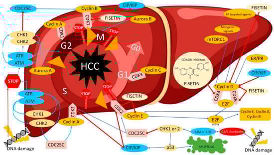The potential mechanisms of cell-cycle inhibition of liver cancer cells (hepatocellular cancer, HCC) by modulation of several regulatory proteins under the influence of fisetin such as CDK4, Cyclin-dependent kinase 4; CDK6, Cyclin-dependent kinase 6; Cyclin D; CDK2, Cyclin-dependent kinase 2; CIP/KIP, the Cip/Kip family, namely, p21(Cip1), p27(Kip1) and p57(Kip2); CDK1, Cyclin-dependent kinase 1; CDC25C, M-phase inducer phosphatase 3; CDK3, Cyclin-dependent kinase 3; CHK1, Checkpoint kinase 1; CHK2, Checkpoint kinase 2; ATM, serine/threonine kinase; ATR, Serine/threonine-protein kinase; AuroraB, Aurora kinase B; AuroraA, Aurora kinase A; E2F, E2 transcription factors.
