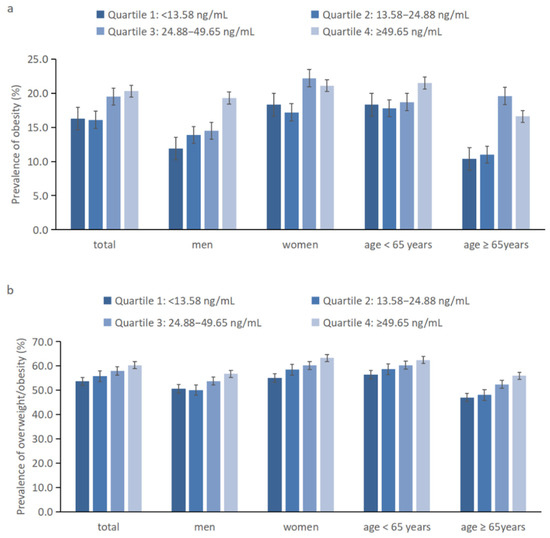 (a) Prevalence of obesity (BMI ≥ 28 kg/m2) at different serum spermidine levels in the general population and subgroups by sex and age. (b) Prevalence of overweight/obesity (BMI ≥ 24 kg/m2) at different serum spermidine levels in the general population and subgroups by sex and age.