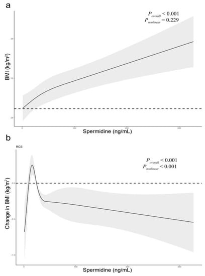 Restricted cubic spline showed a dose-response relationship of serum spermidine (as a continuous variable) with BMI (p = 0.278 for the nonlinear test, Figure 3a). The result demonstrated a weak J-shaped association between serum spermidine and BMI, after adjusting for confounding factors.