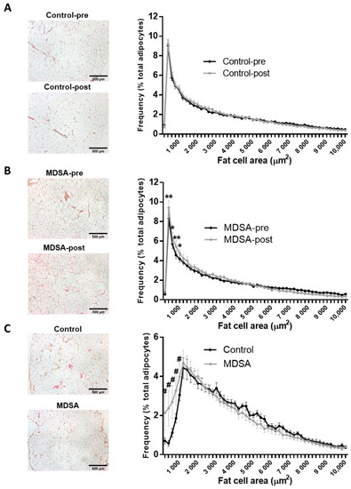Fat cell size distribution. Comparison of frequency distribution and representative images of adipocyte cell surface area in SAT at baseline and at study completion: (A) Control group; (B) MDSA group. (C) Comparison of frequency distribution and representative images of fat cell areas from VAT in control and MDSA groups at the end of the study. Adipocyte areas were divided by size into bin intervals of 200 µm2. Data are presented as average ± SD frequencies of cells within each bin and compared by Holm–Sidak t-test for multiple comparisons. * Different from baseline; # different from control. * = p < 0.05, ** = p < 0.001, and # = p < 0.01 by multiple t-test.