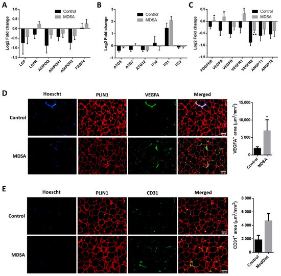 MDSA-mediated modulation of gene expression levels in SAT. Log2 fold change after control or MDSA intervention in mRNA levels of: (A) adipokines, (B) autophagy and senescence genes, and (C) angiogenesis genes. Data are shown as average ± SD and compared by Holm–Sidak t-test. Immunofluorescence detection and representative photomicrographs at magnification ×10 of: (D) VEGFA and (E) CD31. The counterstaining of nuclei (Hoescht) is shown in blue and PLIN1 in red. Data are presented as the average surface ± SD of positive area stained per mm2 and compared by Mann–Whitney U test. * = p < 0.05; ** = p < 0.01.