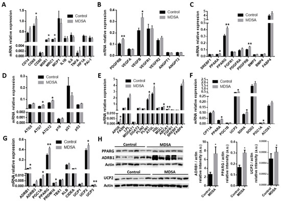 MDSA-mediated modulation of gene expression levels in VAT. Relative mRNA expression at study conclusion of genes related to: (A) inflammation, (B) angiogenesis, (C) adipogenesis, (D) autophagy and senescence, (E) fatty acid metabolism, (F) mitochondrial function and FAO, and (G) beiging. (H) Western blot analysis and optical density quantification of PPARG (57 kDa), ADRB1 (50 kDa) and UCP2 (36 kDa) contents relative to actin (40 kDa). Data are shown as average ± SD and compared to controls by Student’s t-test or Mann–Whitney U test for non-normally distributed data and corrected for multiple comparisons using the Holm–Sidak method. * = p < 0.05; ** = p < 0.01.