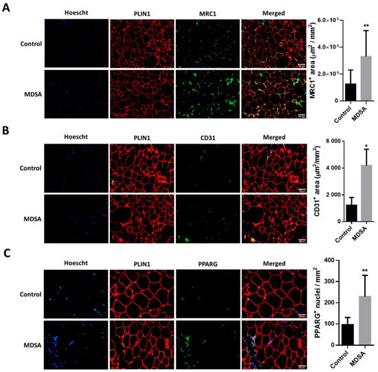 As in SAT, the gene expression of PDGFRB was increased in VAT from women in the MDSA group. Larger VEGFB expression, but not VEGFA expression, was also found (Figure 3B). Additionally, a higher presence of CD31 positive cells was detected by immunofluorescence in tissue sections (Figure 4B). The mRNA gene expression of the adipogenesis marker PPARG was larger in the MDSA group (Figure 3C) and such an increase was confirmed at the protein level by immunoblotting (Figure 3H) and immunofluorescence staining (Figure 4C) of the PPARG2 isoform. The expression of senescence-related genes p16, p21 and p53 was comparable across groups. However, we found an increased expression of autophagy-related ATG7 and ATG12 in VAT from the MDSA group (Figure 3D), while ATG5 showed a non-significant trend (p = 0.054). MDSA also had no effect on the visceral expression of various glucose metabolism-related genes and adipokines (Supplementary Figure S2G–H).