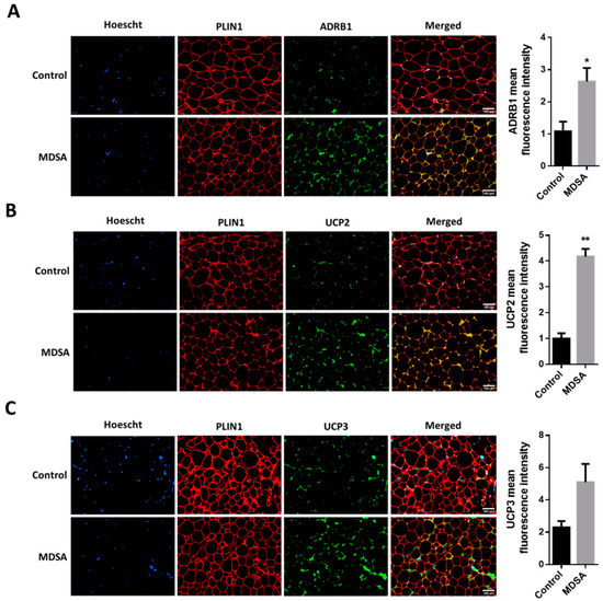 Finally, we also screened several genes implicated in the different steps of FA metabolism. Interestingly, MDSA was associated with a larger expression of the lipolysis-regulating genes PLIN1, ATGL and MGLL (Figure 3E) and this was accompanied with a higher expression of β-adrenoceptor 1 (ADRB1) at mRNA (Figure 3G) and protein level, measured by Western blotting (Figure 3H) and immunofluorescence staining (Figure 5A). Similarly, genes related to FAO and thermogenesis (PPARA, PGC1A) and mitochondrial succinate dehydrogenase complex flavoprotein subunit A (SDHA) appeared to be positively modulated (Figure 3F). The white adipocyte britening marker PRDM16 was upregulated (Figure 3G), while CIDEA showed a trend towards a larger expression (p = 0.07). Despite the browning marker gene UCP1 expression being comparable, an increased expression of the uncoupling proteins UCP2 and UCP3 after MDSA was observed. Larger protein levels of UCP2 were confirmed by immunoblot analysis (Figure 3H) and immunofluorescence (Figure 5B), while UCP3 content was undetectable by Western blot and showed a non-significant trend after immunofluorescence staining of VAT sections (Figure 5C). Furthermore, the MDSA group showed larger mRNA expression of ABCA1 and APOE genes, implicated in cholesterol efflux and HDL formation (Figure 3E).
