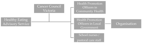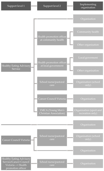 Government support service providers, HEAS and AP, provided direct support to facilities as well as support through the health promotion workforce. The health promotion workforce comprised health promotion officers in local government and community health organisations,; school nurses and pastoral care staff,; and staff in community organisations, and provided direct support to facilities. However, generally, the health promotion workforce support was only available to organisations if healthy eating was a locally identified priority, for example by the local government area.