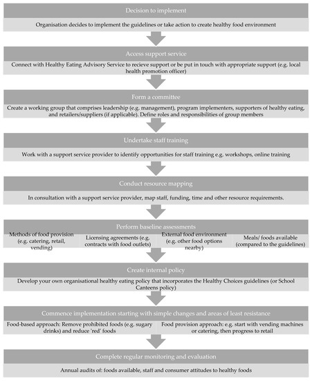 - Boelsen-Robinson, T.; Blake, M.R.; Backholer, K.; Hettiarachchi, J.; Palermo, C.; Peeters, A. Implementing healthy food policies in health services: A qualitative study. Nutr. Diet. 2019, 76, 336–343. [Google Scholar] [CrossRef]