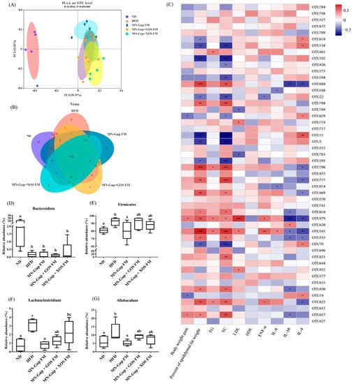Effects of fermented milk containing MN-Gup or MN-Gup-based synbiotics on gut microbiota in HFD-induced obese rats. (A) Principal coordinate analysis (PCoA) based on bacterial operational taxonomic units (OTUs) using Bray-Curtis calculation; (B) Venn diagram; (C) the heatmap of correlation analysis between gut microbiota (based on OTUs) and obesity related indexes (significant correlations were noted by * p < 0.05, ** p < 0.01, and *** p < 0.001); (D,E) the significantly altered bacteria at phylum level; (F,G) the significantly altered bacteria at genus level (different lowercase letters (e.g., a, b, c) indicate significant differences, p < 0.05, n = 5).