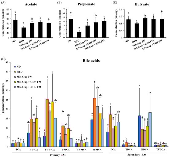 Effects of fermented milk containing MN-Gup or MN-Gup-based synbiotics on the profiles of short chain fatty acids (SCFAs) and bile acids (BAs) in HFD-induced obese rats. The concentration of (A) acetate, (B) propionate, and (C) butyrate was detected in colonic feces (n = 5). (D) The detectable bile acids in colonic feces, taurocholic acid (TCA), alpha-muricholic acid (α-MCA), tauro-alpha-muricholic acid (T-α-MCA), beta-muricholic acid (β-MCA), tauro-beta-muricholic acid (T-β-MCA), omega-muricholic acid (ω-MCA), deoxycholic acid (DCA), taurodeoxycholic acid (TDCA), hyodeoxycholic acid (HDCA) and tauroursodeoxycholic acid (TUDCA). Different lowercase letters (e.g., a, b, c) indicate significant differences, p < 0.05, (n = 4 in ND group, and n = 5 in the rest groups).