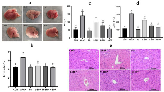 BPP ameliorated APAP-induced liver injury in mice. (a) Liver morphology. (b) Liver index. (c) Serum ALT levels. (d) Serum AST levels. (e) Liver pathological section. Data are expressed as mean ± SD. Different letters indicate statistically significant differences (p < 0.05) between the groups.