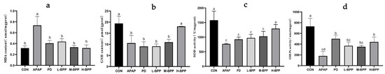 Hepatic MDA, GSH, SOD and GSH-Px content or activities. (a) MDA. (b) GSH. (c) SOD. (d) GSH-Px. Data are expressed as mean ± SD. Different letters indicate statistically significant differences (p < 0.05) between the groups.