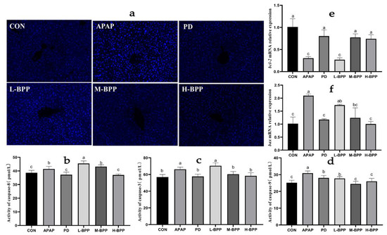 Effect of BPP on liver cell apoptosis induced by APAP. (a) Hoechst 33258. (b) caspase-8. (c) caspase-3. (d) caspase-9. Quantitative analysis of bcl-2 (e) and bax (f). Data are expressed as mean ± SD. Different letters indicate statistically significant differences (p < 0.05) between the groups.
