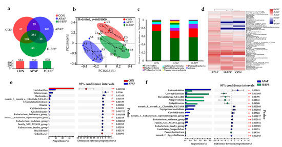 Sobs and Ace indexes reflected the richness of the community. The richness of the H-BPP group was significantly higher than that of the APAP and CON groups (p < 0.05), suggesting that BPP could increase the number of intestinal microorganisms. Shannon and Simpson indexes reflected the diversity of the microbial community. The Simpson index of the APAP group decreased significantly, and the Shannon index increased significantly (p < 0.05), indicating that the diversity of the community increased after APAP treatment, which might be caused by the proliferation of some harmful bacteria (Table S2).