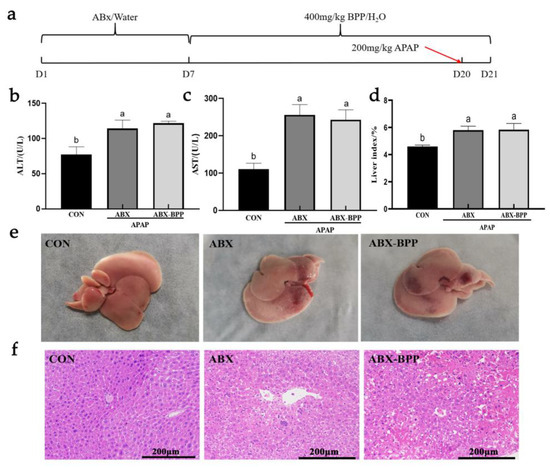 III. We designed the following experiments to confirm that BPP depended on intestinal microbiota to protect mice from liver injury caused by APAP. Mice were randomly divided into 3 groups (n = 8 for each group): control group (CON), antibiotic mixture treated model group (ABX), and antibiotic mixture and BPP treated group (ABX-BPP). ABX and ABX-BPP groups were treated with antibiotics according to the method described in Section 2.4.1, and the other mice were gavaged with sterile water. Then, mice in the ABX-BPP group were gavaged with 400 mg/kg BPP for 14 days, and other groups were gavaged with the same dose of sterile water. On the last day of gavage, mice in ABX and ABX-BPP groups were induced with liver injury according to the method described in Section 2.5 I. We ensured that the mice did not eat within 12 h after taking APAP and then collected samples.