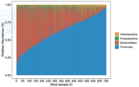 Relative abundances of the 4 most abundant phyla. Each thin vertical bar presents relative abundances determined in 1 individual stool sample, totaling 702.