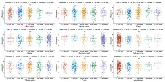 Boxplots for α-diversity Shannon index according to food intake frequencies in different food groups. ns: non-significant.