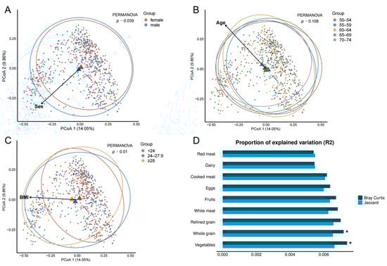 Variation in the gut microbiota composition represented by unconstrained PCoA based on the distance indexes. (A–C) present the grouping patterns of gut microbiota composition based on sex, age, and BMI. (D) shows percentages of variation in gut microbiota composition explained by dietary variables using multi-adjusted permutational ANOVAs (999 permutations). PCoA, principal coordinate analysis. * p-value < 0.05.