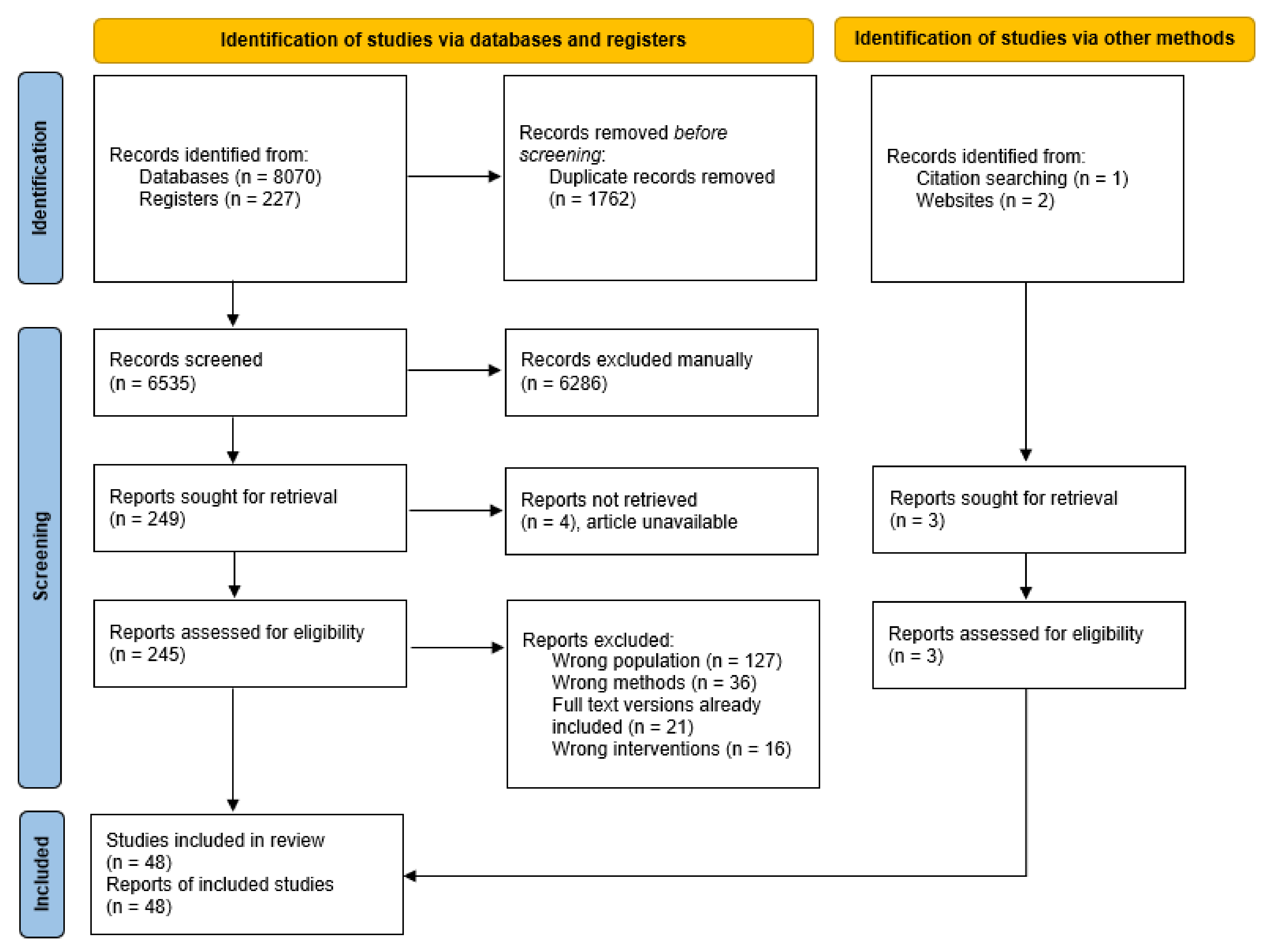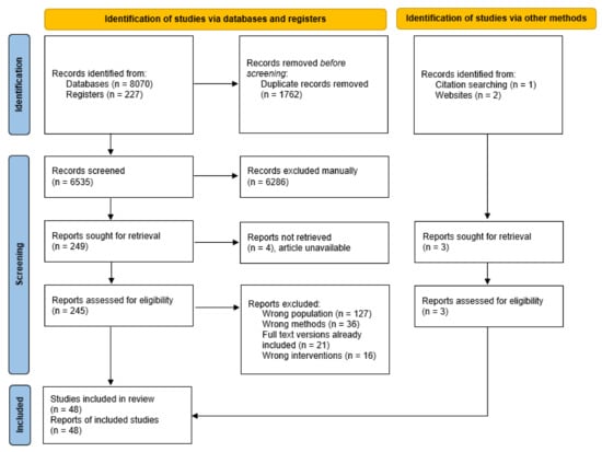 The initial search yielded 8070 records from the databases, 227 records from the clinical trial registries, and 3 records from other sources (Figure 1). After removal of duplicates, 6535 records remained, of which 6286 were excluded following title and abstract screening. Of the 248 full-text articles assessed for eligibility, 200 were excluded. A total of 48 articles met the criteria and were included in narrative synthesis.