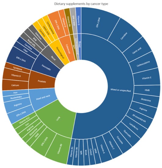 In terms of individual cancer types, and beyond omega-3, the predominant dietary supplements investigated were vitamin B9 in lung cancer (n = 4) [,,,], arginine in head and neck cancer (n = 2) [,], and vitamin D plus calcium in prostate cancer (n = 2) [,]. All remaining dietary supplements investigated in individual cancer types were present only in one study in each of the cancer types. For mixed or unspecified cancer types, carnitine (n = 5) [,,,,] was most commonly prescribed after omega-3, followed by vitamin E (n = 3) [,,], carbocysteine (n = 3) [,,], and lipoic acid (n = 3) [,,]. The remaining dietary supplements investigated in mixed or unspecified cancer types were only present in one or two studies each.