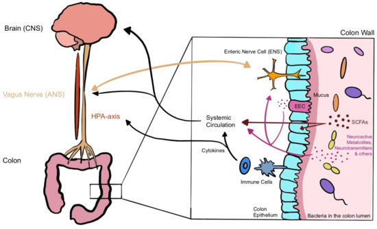 Schematic overview of the bidirectional communication pathways between the gut-microbiota and the brain (Microbiome–Gut–Brain Axis (MGBA)). The colon is inhabited by many different bacteria strains, which directly or indirectly interact with the nerve cells and the brain. The direct pathway includes cytokine signalling after recognition of bacteria through immune cells. Cytokines may also stimulate the body’s stress response via upregulating the hypothalamic–pituitary–adrenal axis (HPA-axis). Indirectly, the bacteria can communicate with their metabolites: utilising dietary fibres, they produce short-chain fatty acids (SCFAs), which are important for epithelium cells and enter the systemic blood circulation. Certain strains of bacteria can produce amino acids or neuroactive metabolites, such as neurotransmitters, which gain access to the brain through blood circulation. Furthermore, bacteria can stimulate enteroendocrine cells, which themselves release hormones into the bloodstream. The bacterial metabolites can also send afferent signals to the brain through enteric nerve cells belonging to the ENS and the vagus nerve. On the other hand, the brain influences important aspects (e.g., motility and mucus secretion) of gut physiology through efferent signals travelling along the vagus nerve and ENS cells. The arrows show the direction of the individual communication pathways and the different signalling stations involved.