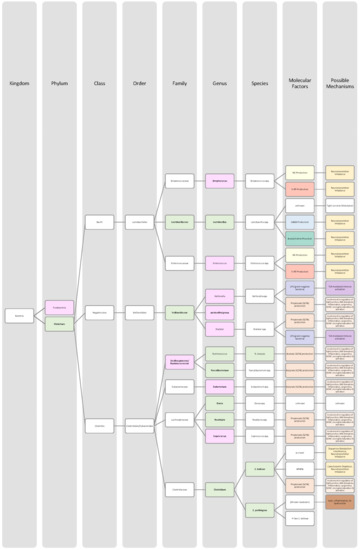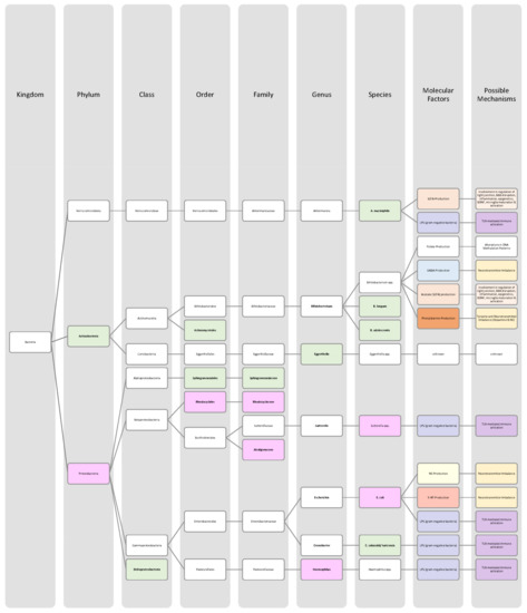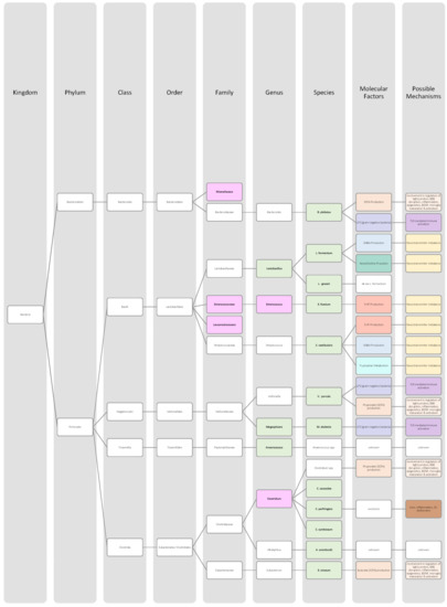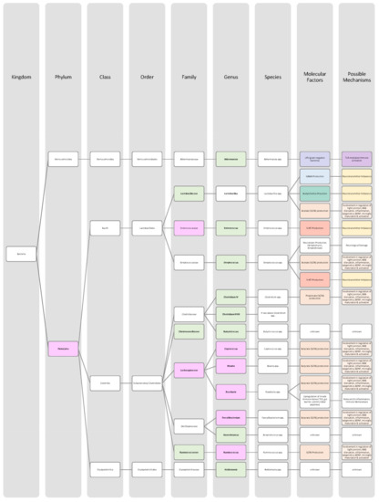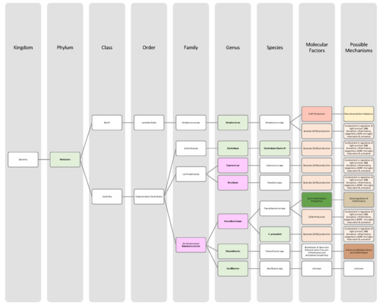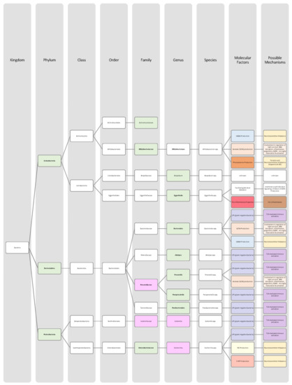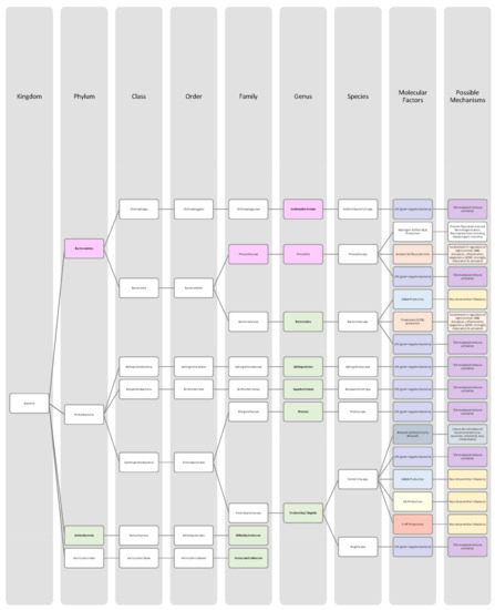 Part 2 of visual representation of the changes in microbiota composition in ASD patients from Table 3. For Figure 3 and Figure 4: The pedigree design highlights the taxonomic classification of the dysbiotic bacteria. Light green cells stand for an increase and the light red cells for a decrease, respectively. Significant changes are shown in bold letters (p < 0.05 or LDA values > 2). White cells indicate that no changes were reported. The last two columns contain additional, non-exhaustive information on how the bacteria are thought to impact the pathogenesis. The second last column to the right depicts bacterial molecular factors, which may be components of the bacteria or bacterial metabolites. Finally, the last column lists possible mechanisms by which these molecular factors may interfere with disease development. The colours summarise factors or mechanisms that are repetitive. Bacterial production or involvement in the metabolism of GABA (light blue, [44]), tryptophan (turquoise, [45]), acetylcholine (emerald colour, [18,20]), noradrenaline (light yellow, [18,20,44]), phenylalanine (dark orange, [27]), 5-HT (salmon colour, [18,20,44]) tyrosine and phenylalanine (dark yellow, [45]) may lead to an imbalance in central nervous system neurotransmitters (yellow). Bacterial toxins such as β2-toxin or hydrogen sulfide are cytotoxic for epithelium cells and contribute to GI inflammation (brown) [3,44]. Clostridium spp. can further synthesise p-cresol and HPHPA, which both interfere with neurotransmitter balance [3,47]. Prevotella copri produces vitamin B1, but its involvement in pathophysiology remains unknown [44]. Gram-negative bacteria’s cell wall containing LPS (light purple) can stimulate TLRs located on immune cells (lilac, [21,31]). TLR-mediated immune activation is eventually leading to systemic inflammation, BBB disturbance, and neuroinflammation [14]. SCFAs deriving from bacteria are involved in microglia maturation and activation, BDNF-production, tight junction regulation in the gut barrier as well as in the BBB, epigenetic and inflammatory processes (light orange, [18,20,26,29]). If the involvement of the bacterial strain in the disease pathogenesis remains elusive, the last two columns are labelled as unknown, respectively. 5-HT = serotonin; ASD = autism spectrum disorder; BBB = blood–brain barrier; BDNF = brain-derived neurotrophic factor; GABA = gamma-Aminobutyric acid; GI = gastrointestinal; HPHPA = 3-(3-hydroxyphenyl)-3-hydroxypropionic acid; LPS = lipopolysaccharide; NE = noradrenaline; p-cresol = para-cresol; SCFA = short-chain fatty acid; TLR = Toll-like receptor.