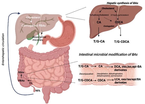Biotransformation of biliary acids. BA metabolism starts with cholesterol and is converted into PBA in the liver (CA and CDCA). Subsequently, these are conjugated with glycine or taurine (T/G-CA and T/G-CDCA), stored in the gallbladder, and released in the intestine. Here, the conjugated BA are first deconjugated by intestinal bacteria and then metabolized through a series of chemical reactions (desulfation, dehydrogenation, dihydroxylation, and epimerization) catalyzed by bacterial enzymes to other types of SBA (DCA and LCA and oxo, iso, epi-BA derivates).