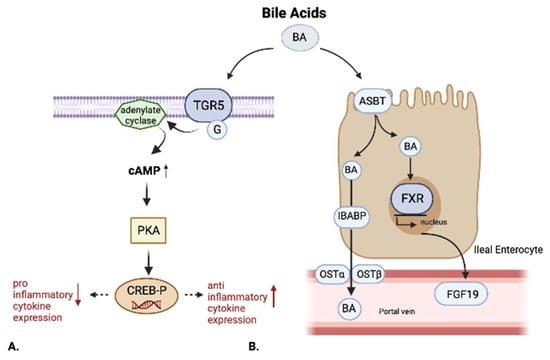 The effects of BA through TGR5 and FXR receptors. (A) BA actives TGR5(Takeda G-protein-coupled receptor 5) and determines the activation of PKA (protein kinase A), which phosphorylates CREB (cAMP response element-binding protein). CREB inhibits the transcription of pro-inflammatory cytokines and induces those of anti-inflammatory cytokines. (B) The ASBPT (sodium-dependent bile acid transporter) allows the entrance of BA (bile acids) into the ileal enterocyte followed by the activation of FXR (farnesoid-X- receptor), which regulates the synthesis and expression of FGF19 (fibroblasts growth factor). It suppresses BA synthesis. The transport and the excretion of BA in the portal circulation are done by IBABP (intestinal bile acid-binding protein) and OSTα and OSTβ (organic solute transporter).