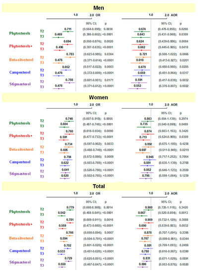 Odds ratio (95% confidence interval) for CVD in relation to total and individual phytosterol intake (relative to 1st tercile). T2—2nd tercile; T3—3rd tercile; OR—odds ratio; AOR—adjusted odds ratio; ORs were unadjusted in men and women but adjusted for sex combined; AORs—adjusted for age, lipid-lowering medication, HDI, BMI, alcohol, and additionally for sex in total.