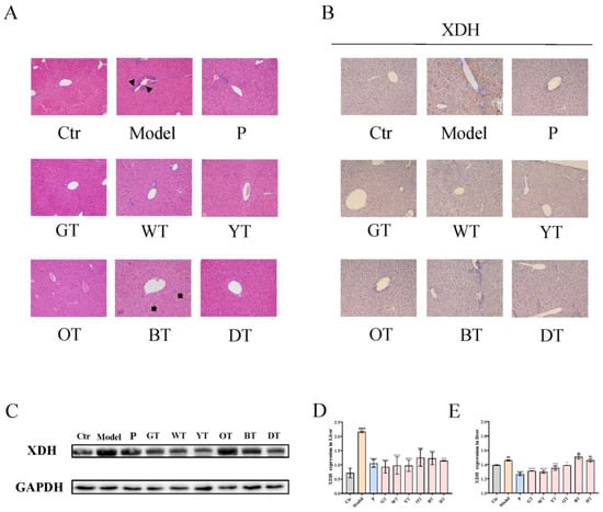 Mechanism of TWEs on UA metabolism in the liver. (A) Representative H&E-stained liver tissue images of different treatment groups: triangles indicate inflammatory infiltration and arrows indicate vacuolar degeneration of hepatocytes (200×). Representative IHC (B) and Western blotting (C) images of XDH expression in the liver. Quantification of XDH expression by Western blotting (D) and IHC (E). The data are expressed as mean ± SD. ## p < 0.01, #### p < 0.0001 were compared with the control, ns p > 0.1, * p < 0.1, *** p < 0.001, **** p < 0.0001 were compared with the model.