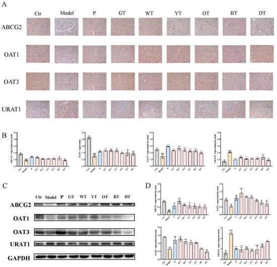 To explore the effects of TWEs on regulating renal uric acid transporters, we analyzed the expression of uric acid secretion transporters ABCG2, OAT1, OAT3, and uric acid reabsorption transporter URAT1. As shown in Figure 4, treatment with TWEs significantly upregulated ABCG2, OAT1, and OAT3, and downregulated the renal levels of URAT1.