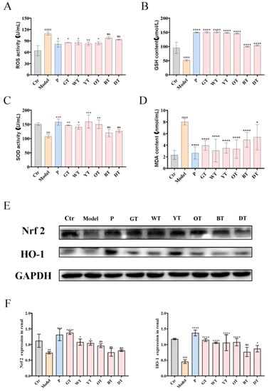Mechanisms of TWEs in relieving renal oxidative stress. (A) Serum ROS activity. (B) Serum GSH levels. (C) Serum SOD levels. (D) Serum MDA activity. Representative immunoblots (E) images of Nrf2 and HO-1 expression in the kidney. Quantification of Nrf2 and HO-1 expression by Western blotting (F). The data are expressed as mean ± SD. ## p < 0.01, ### p < 0.001, #### p < 0.0001 were compared with the control, ns p > 0.1, * p < 0.1, ** p <0.01, *** p < 0.001, **** p < 0.0001 were compared with the model.