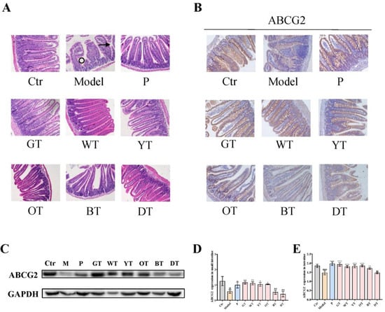 The intestine is one of the important organs for uric acid excretion. ABCG2 regulates intestinal uric acid excretion, thereby maintaining the balance of uric acid metabolism. Histopathological analysis of the small intestine showed that compared with the control group, the model group exhibited shedding of villi and abnormal crypt structure, which were alleviated by TWE treatment (Figure 6A). Then, we analyzed the expression level of uric acid secretion transporters ABCG2, as shown in Figure 6B–E, and the results revealed that compared with untreated normal mice, the expression levels of ABCG2 in the intestines of TWEs-treated mice were all elevated. Among them, except for the dark tea group, all showed significant effects. Overall, compared with heavily fermented tea, lightly fermented tea may have a more significant promoting effect on the expression of intestinal uric acid secretion transporter ABCG2 in general.