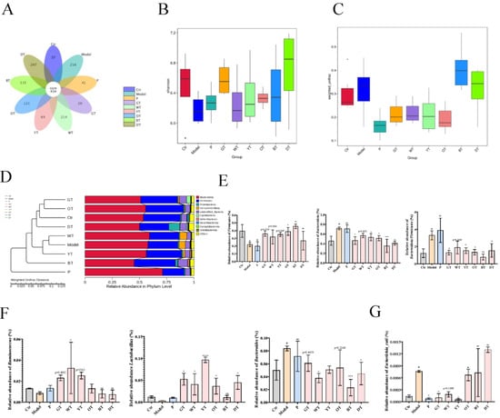 By sequencing the 16S rRNA V3-V4 region of fecal DNA extracted from different groups of mice (Eight mice per group), according to species annotation, the alpha diversity and beta diversity were further calculated, and the differences between groups were compared and analyzed. This revealed the effect of TWE treatment on the HUA structure of the mouse gut microbial community. As shown in Figure 7A, the specific OTU numbers of intestinal flora in the control group, model group, positive drug group, GT group, WT group, YT group, OT group, BT group, and DT group were 37, 216, 41, 20, 214, 49, 121, 315, and 267, respectively, which showed that the species composition of the fecal microbiota of HUA mice and different TWE treatments were changed. Changes in gut microbial communities were further assessed in terms of alpha and beta diversity. The combined results of Shannon’s analysis of alpha diversity and boxplots based on weighted UniFrac beta diversity showed that there were differences in species diversity among different taxa, and the diversity and richness of the fecal microbiota of mice treated with TWEs showed signs of recovery. Compared with the control group, the species composition of the model group was more abundant; the DT group had the most abundance of species composition diversity in the fecal microbiota of mice treated with TWEs, followed by the GT group, which also showed a rich species diversity (Figure 7B,C). The results of the phylum-level UPGMA clustering tree analysis based on weighted UniFrac distances showed that the relative abundance of Firmicutes decreased significantly in the model group and increased after TWE treatment, while the relative abundance of Bacteroidota increased significantly and decreased after TWE treatment. In addition, the relative abundance of the Firmicutes/Bacteroidota ratio increased significantly in the model group, but decreased after TWE treatment, indicating that TWE treatment had a certain alleviating effect on HUA (Figure 7D,E). Furthermore, through the relative abundance analysis of Ruminococcus, Lactobacillus, and Bacteroides at the genus level, the results showed that TWE treatment promoted the metabolism of uric acid, and alleviated HUA by upregulating the relative abundance of Ruminococcus and Lactobacillus. On the other hand, TWE treatment reduced the relative abundance of Bacteroides, inhibited the uric acid synthesis and alleviated HUA (Figure 7F). Moreover, the species-level results indicated that TWE treatment reduced the relative abundance of Escherichia coli, inhibited the secretion of XOD, reduced uric acid production, and thereby alleviated HUA (Figure 7G).
