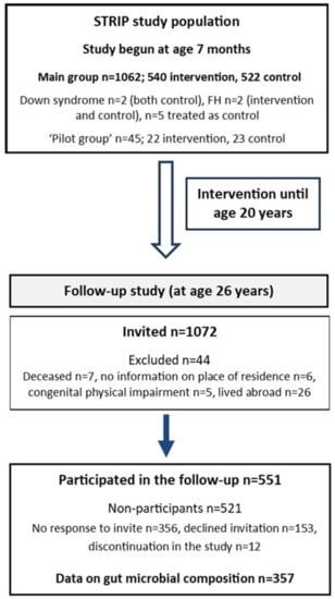 - Simell, O.; Niinikoski, H.; Rönnemaa, T.; Raitakari, O.; Lagström, H.; Laurinen, M.; Aromaa, M.; Hakala, P.; Jula, A.; Jokinen, E.; et al. Cohort Profile: The STRIP Study (Special Turku Coronary Risk Factor Intervention Project), an infancy-onset dietary and life-style intervention trial. Int. J. Epidemiol. 2009, 38, 650–655. [Google Scholar] [CrossRef]