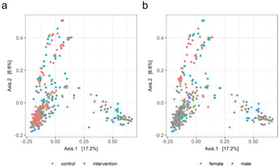 PCoA ordination plots for gut microbiota beta diversity: (a) in the dietary counselling intervention and control groups (PERMANOVA R2 = 0.004, p = 0.09) and (b) for females and males (R2 = 0.005, p = 0.01).