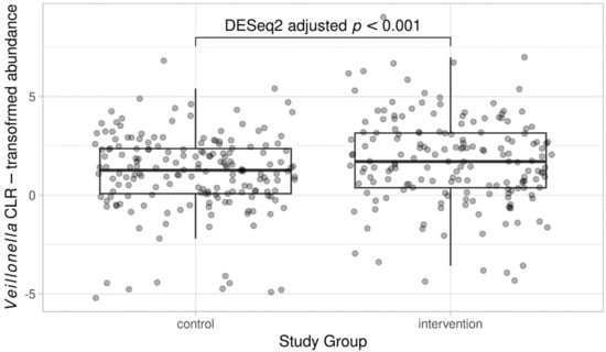 In DESeq2, no phylum-level differences were observed between the study groups when males and females were analyzed together (Figure S1). However, the abundance of one bacterial family, Veillonellaceae, was elevated in the intervention group compared to the control group (log2 fold-change 0.75, adjusted p = 0.007), and genus Veillonella was consistently and significantly more abundant in the intervention group (log2 fold-change 1.58, adjusted p < 0.001; Figure 3). No other family or genus-level bacterial signatures with significant association with the study group were observed. Retrospective species-level inspection suggested that the observed differences in the abundance of genus Veillonella may have originated from two distinct Veillonella species, namely, V. dispar and V. rogosae, the abundance of which varied between the study groups (log2 fold-change 1.31 and adjusted p < 0.001 vs. log2 fold-change 1.31 and adjusted p = 0.003, respectively). In addition, the abundance of the species Flavonifractor plautii appeared to differ between the study groups (log2 fold-change 0.82, adjusted p = 0.028).