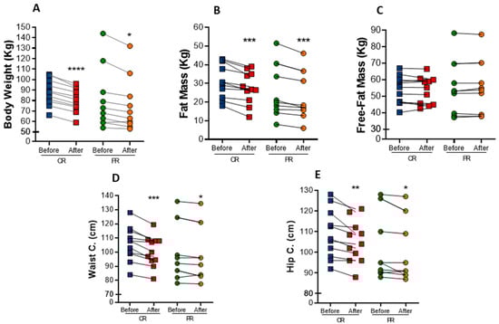 Anthropometric changes after caloric restriction (CR) or protein restriction (PR). (A) Body weight (**** p = < 0.0001 and * p = 0.0176). (B) Fat mass comparing before and after caloric or protein restriction (*** p = 0.0010 and ** p = 0.0033). (C) Free-fat mass comparing before and after caloric or protein restriction ( p = 0.7929 and p = 0.6464). (D) Waist circumference comparing before and after caloric or protein restriction (*** p = 0.0009 and * p = 0.0325). (E) Hip circumference comparing before and after caloric or protein restriction (** p = 0.0091 and * p = 0.0383). Data are presented in dot-plot format. ANOVA mixed-design analysis of variance was performed.