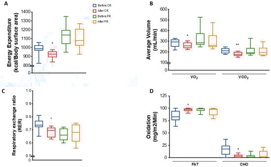 Energy expenditure and substrate utilization after caloric restriction (CR) or protein restriction (PR). Data obtained using indirect calorimetry. (A) Energy expenditure before and after CR (* p = 0.0311) and before and after PR (ns p = 0.7568). (B) Average volume of VO2 and VCO2 before and after CR (* p = 0.0126 and ** p = 0.0051) and before and after PR (ns p = 0.2736 and ns p = 0.5507). (C) RER (respiratory exchange ratio) before and after CR (* p = 0.0296) and before and after PR (ns p = 0.8571). (D) Lipid (FAT) and carbohydrate (CHO) oxidation before and after CR (* p = 0.0454 and * p = 0.0452) and before and after PR ( p = 0.4281 and p = 0.4270). Data are shown in box plot format. ANOVA mixed-design analysis of variance was performed.