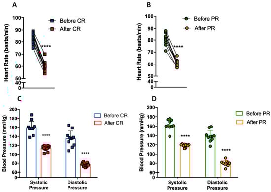 We investigated whether CR and PR could modify heart rate and blood pressure in individuals with metabolic syndrome. Heart rate at rest decreased from 83 ± 4 bpm to 60 ± 4 bpm with CR (p < 0.0001) (Figure 3A). Similarly, PR reduced heart rate from 81 ± 5 bpm to 61 ± 2 bpm (p < 0.0001) (Figure 3B). The CR group had a reduction of 40.9% (p < 0.0001) and 73.7% (p < 0.0001) of systolic and diastolic blood pressure, respectively (Figure 3C), while the PR group had a reduction of 37.7% (p < 0.0001) and 73.2% (p < 0.0001), respectively (Figure 3D). Remarkably, these patients went from hypertensive (CR: 159/113; PR: 162/118) to borderline normotensive (CR: 135/77; PR: 138/79) blood pressure levels.