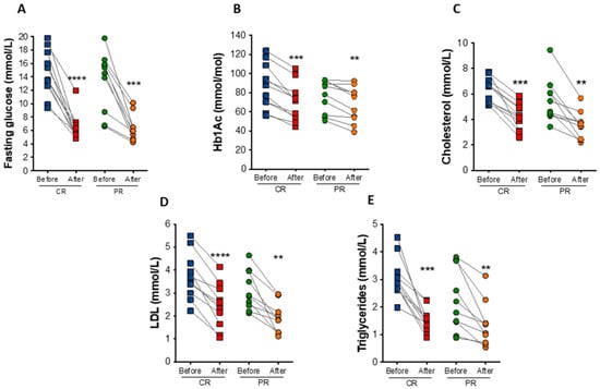 Biochemical changes after caloric restriction (CR) or protein restriction (PR). (A) Fasting glucose levels (**** p < 0.0001 and *** p = 0.0009). (B) Hemoglobin A1c (HbA1c) levels (*** p = 0.0001 and ** p = 0.0069). (C) Total cholesterol levels (*** p = 0.0002 and ** p = 0.0047). (D) low-density lipoprotein (LDL) cholesterol levels (**** p = <0.0001 and ** p = 0.0026). (E) Triglycerides levels (*** p = 0.0004 and ** p = 0.0097). Data are presented in dot-plot format. ANOVA mixed-design analysis of variance was performed.