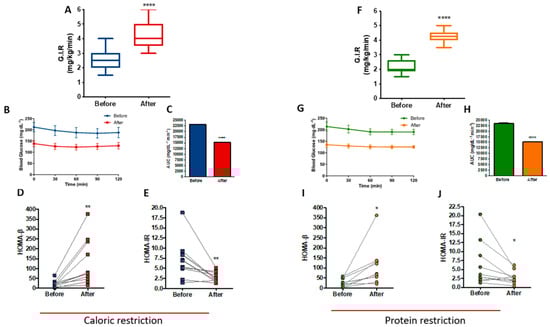 Improved insulin sensitivity after caloric restriction (CR) or protein restriction (PR). Results obtained using hyperinsulinemic-euglycemic clamp or HOMA-β and HOMA-IR. (A) Glucose infusion rate (GIR) comparing before and after caloric restriction (**** p = < 0.0001). (B) Glycemic curve during the clamp. (C) Area under the curve of B (**** p = < 0.0001). (D) HOMA-β comparing before and after caloric restriction (** p = 0.0056). (E) HOMA-IR comparing before and after caloric restriction (** p = 0.0057). (F) GIR comparing before and after protein restriction (**** p = < 0.0001). (G) Glycemic curve during the clamp. (H) Area under the curve of G (**** p = < 0.0001). (I) HOMA-β comparing before and after protein restriction (* p = 0.0199). (J) HOMA-IR comparing before and after protein restriction (* p = 0.0460). Data are shown in box plot and dot plot format. Paired t-test was performed.