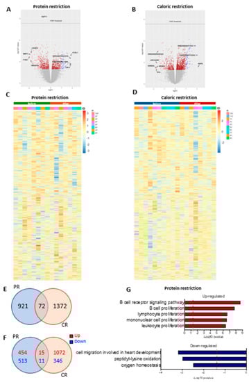 The genes altered by PR or CR are shown in volcano plots in Figure 6A,B and heatmaps in Figure 6C,D, respectively. In total, approximately 24,000 genes were evaluated. We did not observe significant changes (considering false discovery rate < 0.05) in the adipose tissue transcriptome in patients undergoing either PR or CR. However, an exploratory analysis using the fold change (p-value < 0.05) showed that 993 genes were altered after PR, 1444 genes had alterations after CR, and 72 genes shared alterations in both nutritional interventions (Figure 6E). PR had 469 upregulated genes and 524 downregulated genes, while CR had 1087 upregulated genes and 357 downregulated genes; 15 upregulated genes and 11 downregulated genes shared alterations between the two interventions (Figure 6F). However, 46 genes had opposite directions between PR and CR, suggesting that the similarities between the PR and the CR effect could be random. Multiple pathways were enriched after PR (FDR < 0.05); however, we did not see significant changes after CR (FDR < 0.05). After PR, terms enriched among the upregulated genes included “B cell receptor signaling pathway”, “B cell proliferation”, “lymphocyte proliferation”, “mononuclear cell proliferation”, and “leukocyte proliferation”. Terms enriched among the downregulated genes included “cell migration involved in heart development”, “peptidyl-lysine oxidation”, and “oxygen homeostasis” (Figure 6G).