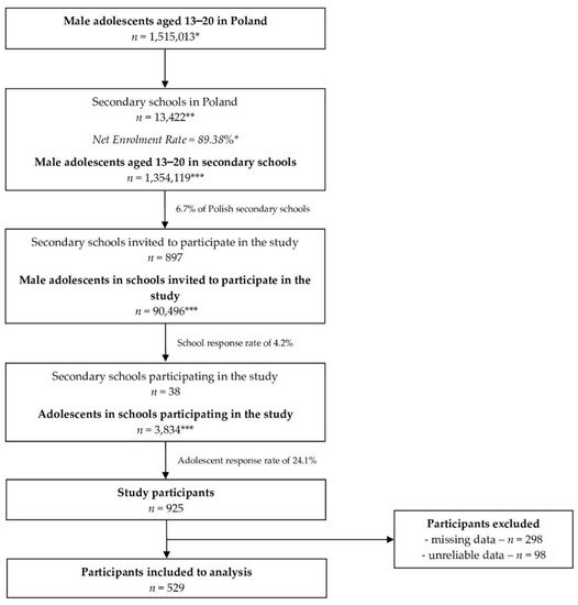 The detailed sampling and recruitment procedure is presented in Figure 1. The final sample gathered within the study was 925 participants, while 529 of them were included in the analysis. The required minimum sample size was calculated as 384 based on the size of the population of male adolescents aged 13–20 years in Poland, of 1,515,013 for December 2020 (data of the Central Statistical Office in Poland [14]), for the assumed confidence level of 95% and the maximum error of 5%.