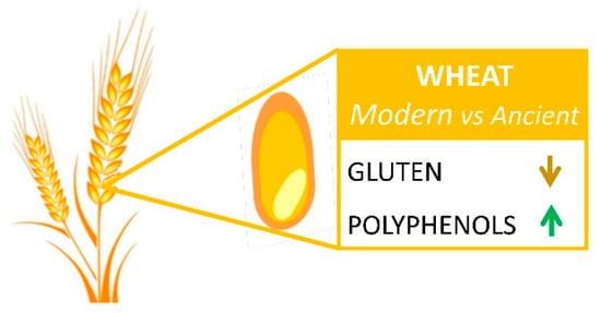 The purpose of this review is to provide an up-to-date overview of the role of wheat components in triggering gluten/wheat-related syndromes, including the difference in gluten content and composition between ancient and modern wheat varieties. In addition, the potential protective mechanisms of polyphenols in reducing gluten bioavailability and mitigating gluten-related symptoms will be addressed, including the effect of polyphenols on innate immunity, inflammation, intestinal barrier function, and dysbiosis.