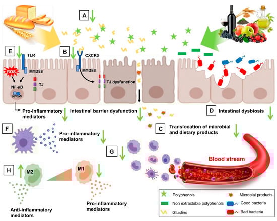 The potential targets of polyphenols and their metabolites in NCGS. Polyphenols can bind and sequester gluten, reducing gluten bioavailability (A); they can inhibit the interaction between gliadin peptides and CXCR3 receptors, restoring the altered intestinal permeability (B) then reducing the translocation of microbial and dietary products (C); they can also affect the intestinal dysbiosis improving the intestinal barrier dysfunction (D). Polyphenols can blunt oxidative stress and inflammation-induced pathways at gut level (E) and suppress the overwhelming inflammatory immune response (F), reducing the recruitment of myeloid cells in the lamina propria (G) and increasing M2-polarized anti-inflammatory macrophages (H). The green arrow indicates the effects of polyphenols: up arrow corresponds to induction; down arrow corresponds to inhibition. TLR: Toll-like receptor; CXCR3: C-X-C Motif Chemokine Receptor 3; TJ: tight junction; ROS: reactive oxygen species; NF-ĸB: nuclear factor-κB; M1: M1-polarized macrophage; M2: M2-polarized macrophage.