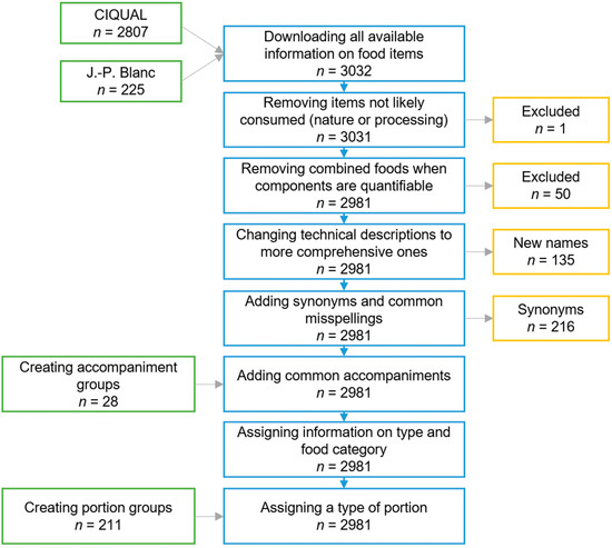 The 2017 official French food composition tables were made up of 2807 food and drink items. Nine of CIQUAL’s subgroups (salad-based dishes, other meat products, dairy products and desserts, jams, ice creams, sorbets, frozen desserts, cooking aids, and food for particular nutritional uses) that were deemed not to adequately reflect the French market were enhanced with 225 selected items for J.-P. Blanc’s book’s database, for a total of 3032 items. After further steps detailed in Figure 2, the final database included 2981 food and drink items, 28 accompaniment groups, and 211 portion groups.